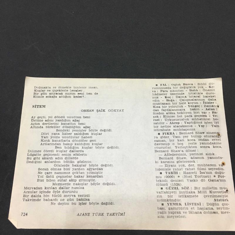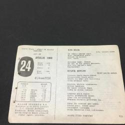 24 ARALIK 1960 -TAKVİM YAPRAĞI-DOĞUM GÜNÜ HEDİYESİ- AJANS TÜRK - ŞİİRLİ VE SAATLİ TAKVİMİ,ZİYA OSMAN SABA,SUAT SALİH ASRAL,ORHAN ŞAİK GÖKYAY,FAL,FIKRA,HZ İSANIN DOĞUMU,0000,VASKO DÖ GAMA NIN ÖLÜMÜ 1524,GÜZEL SÖZ,YEMEK LİSTESİ başlıklı ürün, Efemera, Müzik, Sinema > Belge ve Evraklar > Takvimler kategorisi altında İkinci El olarak satılmaktadır.