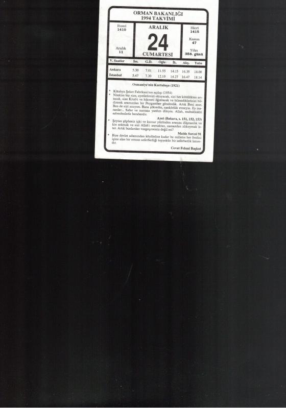 24 ARALIK 1994 CUMARTESİ - ORMAN BAKANLIĞI TAKVİMİ -, en son bir ay önce güncellenmiştir.