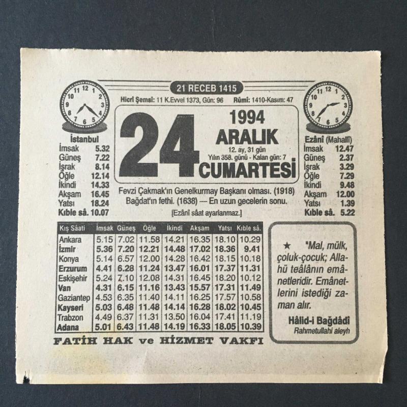 24 ARALIK 1994 -TAKVİM YAPRAĞI-DOĞUM GÜNÜ HEDİYESİ-FATİH HAK VE HİZMET VAKFI TAKVİMİ,FEVZİ ÇAKMAKIN GENEL KURMAY BAŞKANI OLMASI 1918,BAĞDATIN FETHİ 1638,EN UZUN GECELERİN SONU,İSHAK FAKİH VE VAKFİYESİ,BEN KİMİM, en son 8 ay önce güncellenmiştir.