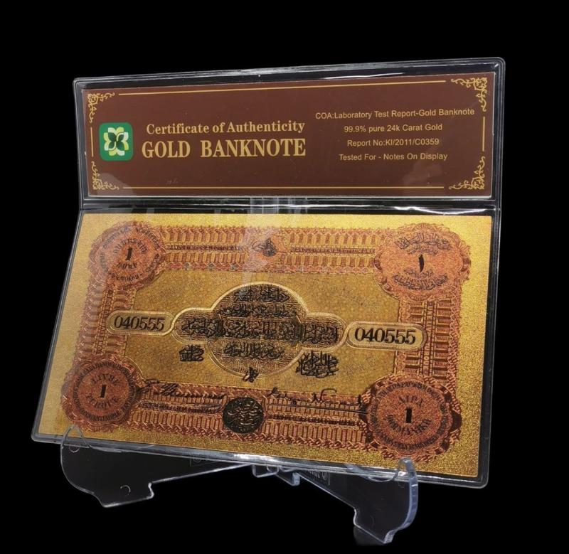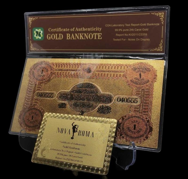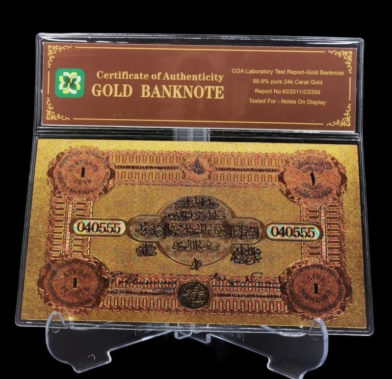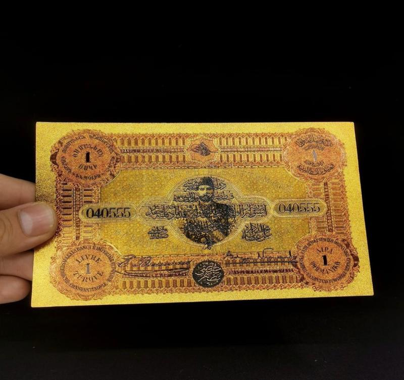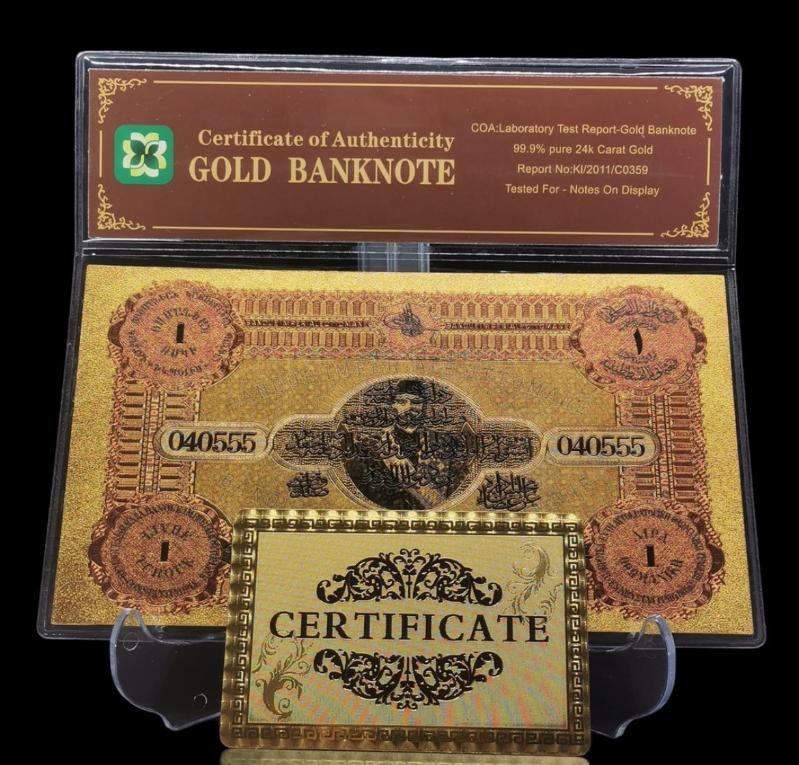 24 Ayar Altın Kaplama Osmanlı Banknot Sertifikası İle Beraber Osmanlı Konstantinapolis 1 Livre Hatıra Sertifikalı Banknot Dünyada 4 Dilde (Osmanlıca, Fransızca, Rumca ve Ermenice) Basılan İlk Ve Tek Örnektir. Zamanında II. Abdülhamid Fermanı ile bastırılmış olup Osmanlı İmparatorluğu'nun çok dilli etnik yapısını temsil etmektedir.