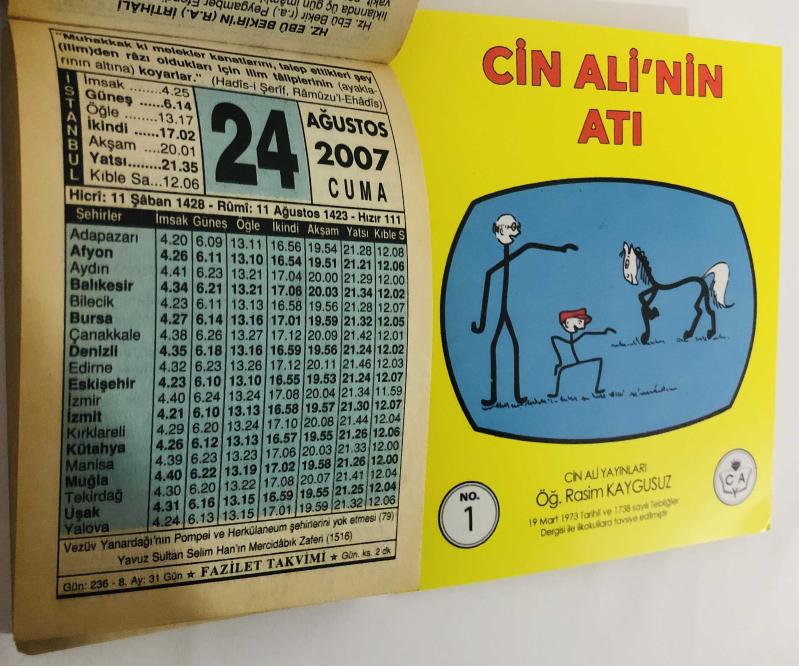 24 Ağustos 2007 hediyelik orijinal Fazilet takvim yaprağı (Cin Ali kitabı hediyeli:), 3 yıl önce satışa sunulmuştur.