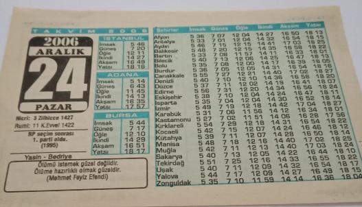 24 Aralık 2006-Orijinal Takvim Yaprağı-Doğum Günü-Söz,Nişan,Nikâh,Düğün ve Önemli Günler Hediyesi-Bizim Anadolu Takvimleri-Ayet(Mehmet Feyiz Efendi)-RP seçim sonrası 1. parti oldu(1995)-Yasin Bedriye-Neden Terfi Olmuş, en son 2 ay önce güncellenmiştir.