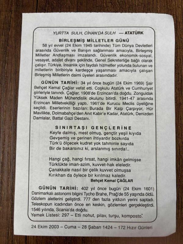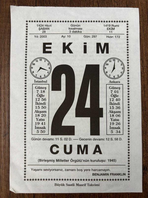 24 EKİM 2003 - TAKVİM YAPRAĞI - DOĞUM GÜNÜ HEDİYESİ - BÜYÜK SAATLİ MAARİF TAKVİMİ - BENJAMIN FRANKLIN - ATATÜRK - BİRLEŞMİŞ MİLLETLER GÜNÜ - ŞAİR BEHÇET KEMAL ÇAĞLAR VEFAT ETTİ - BEHÇET KEMAL ÇAĞLAR - ASTRONOMİ BİLGİNİ TYCHO BRAHE ÖLDÜ, en son 8 ay önce güncellenmiştir.