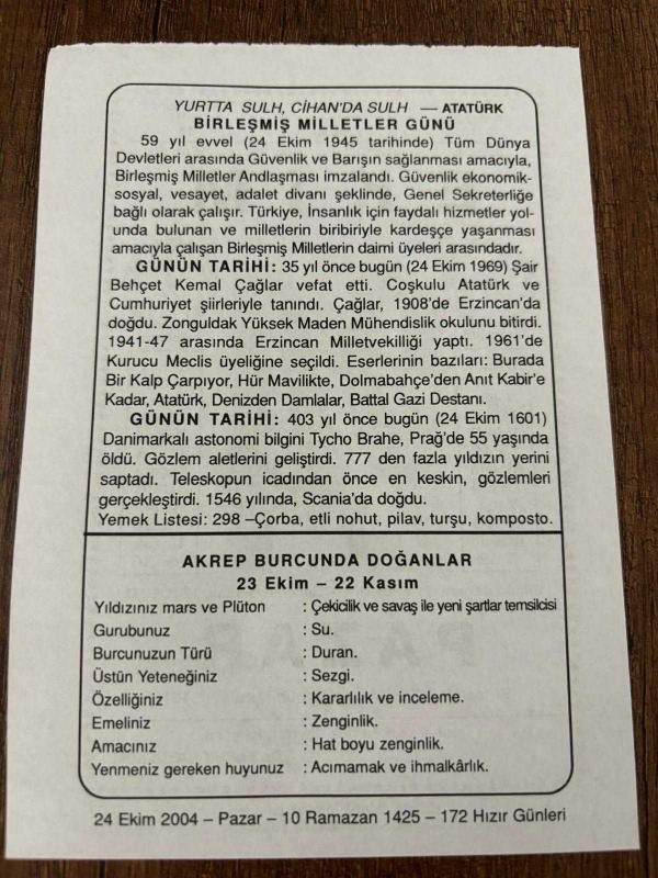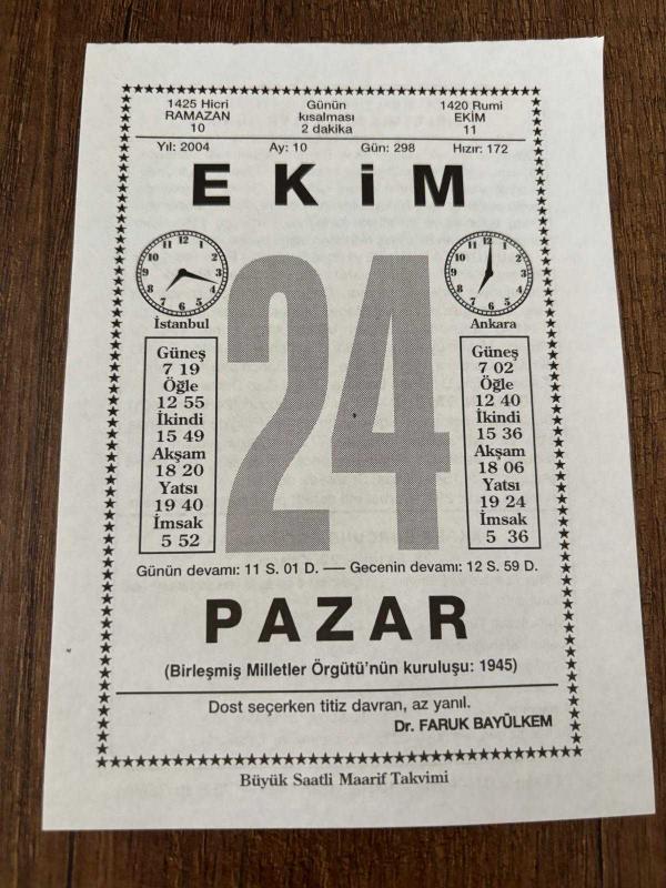 24 EKİM 2004 - TAKVİM YAPRAĞI - DOĞUM GÜNÜ HEDİYESİ - BÜYÜK SAATLİ MAARİF TAKVİMİ - DR.FARUK BAYÜLKEM - ATATÜRK - BİRLEŞMİŞ MİLLETLER GÜNÜ - ŞAİR BEHÇET KEMAL ÇAĞLAR VEFAT ETTİ - BEHÇET KEMAL ÇAĞLAR - ASTRONOMİ BİLGİNİ TYCHO BRAHE ÖLDÜ - AKREP BURCUNDA DOĞANLAR, en son 7 ay önce güncellenmiştir.