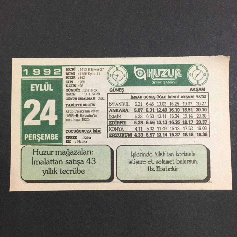 24 EYLÜL 1992 -TAKVİM YAPRAĞI-DOĞUM GÜNÜ HEDİYESİ-HUZUR TAKVİMİ,KATİP ÇELEBİNİN VEFATI 1658,BOLVADİNİN KURTULUŞU 1922,SÜNNETE SARILALIM,MUTFAKTA DÜZEN,EV HAYATI başlıklı ürün, Efemera, Müzik, Sinema > Belge ve Evraklar > Takvimler kategorisi altında İkinci El olarak satılmaktadır.