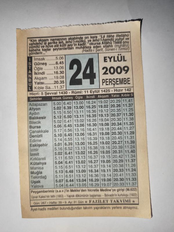24 Eylül 2009-Orijinal Takvim Yaprağı-Doğum Günü-Söz,Nişan,Nikâh,Düğün ve Önemli Günler Hediyesi-Fazilet Takvimi-Ayet(Hadis)(Hadis-i Şerif, Sünen-i Tirmizi)-Peygamberimiz (s.a.v)'in Mekke'den hicretle Medine'ye girişi (M.622)-Şeytan'ın Hileleri başlıklı ürün, Efemera, Müzik, Sinema > Belge ve Evraklar > Takvimler kategorisi altında İkinci El olarak satılmaktadır.