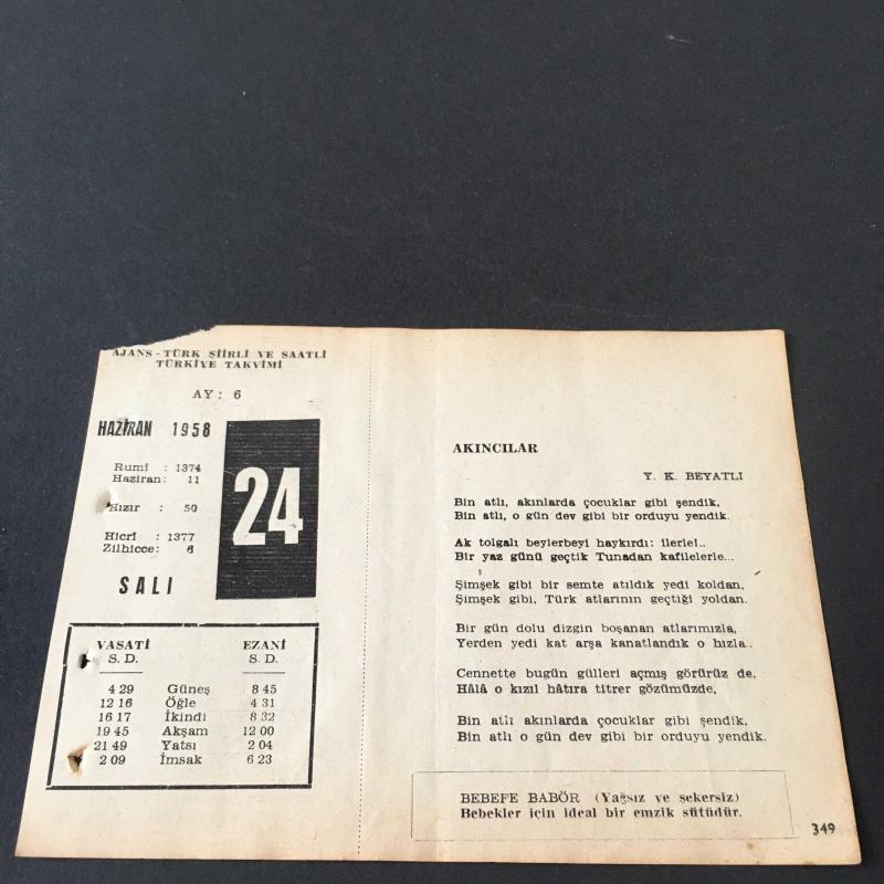24 HAZİRAN 1958 -TAKVİM YAPRAĞI-DOĞUM GÜNÜ HEDİYESİ-AJANS-TÜRK ŞİİRLİ VE SAATLİ TÜRKİYE TAKVİMİ,Y.K.BEYATLI,H.F.OZANSOY,FAL,FIKRA,TÜRK ORDUSUNUN GİRİTİ İŞGALİ 1645,GÜZEL SÖZ,YEMEK LİSTESİ başlıklı ürün, Efemera, Müzik, Sinema > Belge ve Evraklar > Takvimler kategorisi altında İkinci El olarak satılmaktadır.