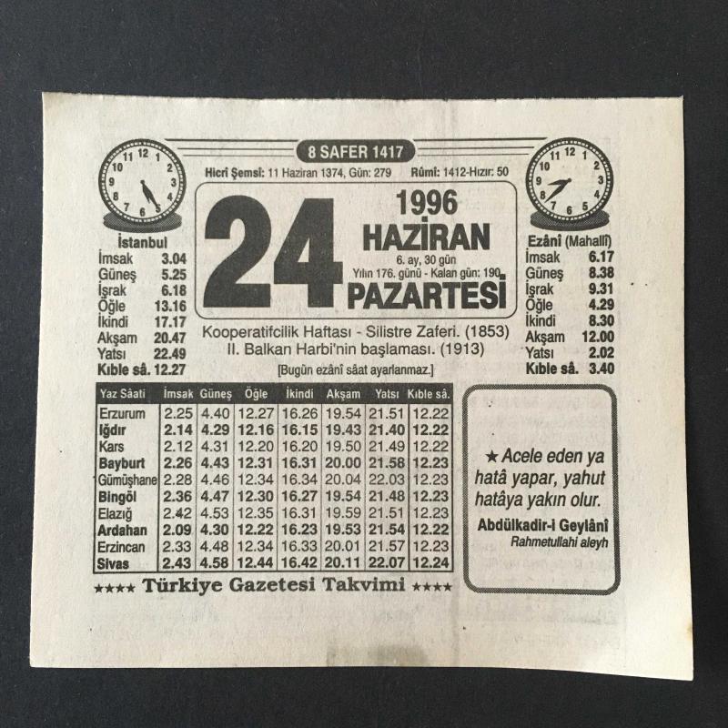 24 HAZİRAN 1996 -TAKVİM YAPRAĞI-DOĞUM GÜNÜ HEDİYESİ-TÜRKİYE GAZETESİ TAKVİMİ,KOOPERATİFÇİLİK HAFTASI, SİLİSTRE ZAFERİ 1853,2.BALKAN HARBİNİN BAŞLAMASI 1913,,KARANLIK GÜNLER, en son 8 ay önce güncellenmiştir.