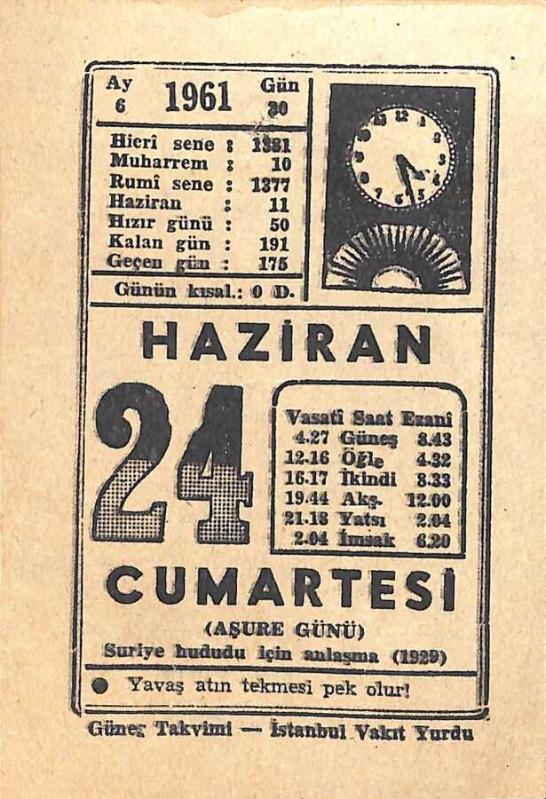 24 Haziran 1961 Takvim Yaprağı - Doğum Günü Hediyesi EFM(N)11333 başlıklı ürün, Efemera, Müzik, Sinema > Belge ve Evraklar > Takvimler kategorisi altında İkinci El olarak satılmaktadır.