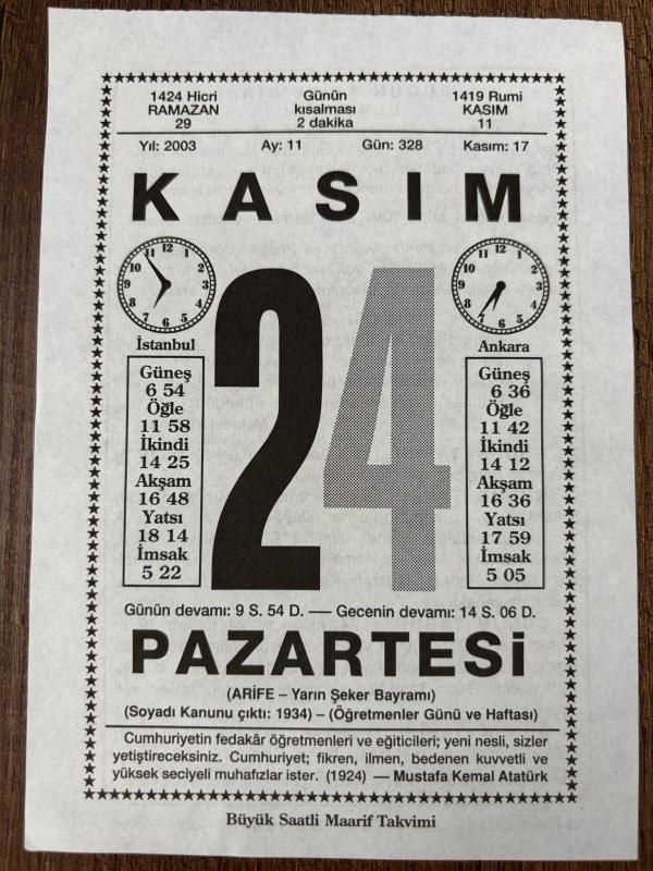 24 KASIM 2003 - TAKVİM YAPRAĞI - DOĞUM GÜNÜ HEDİYESİ - BÜYÜK SAATLİ MAARİF TAKVİMİ - MUSTAFA KEMAL ATATÜRK - ÖĞRETMENLER GÜNÜ - MAHMUT YILMAZ - İLK MİZAH DERGİSİ DİYOJEN YAYINLANDI - SOYADI KANUNUNUN ÇIKMASI - AHMET İHSAN BAHÇIVANGİL VEFAT ETTİ - ÇEMBELLİTAŞ TURŞUCUSU METİN GÖKYILDIZ VEFAT ETTİ, 7 ay önce satışa sunulmuştur.