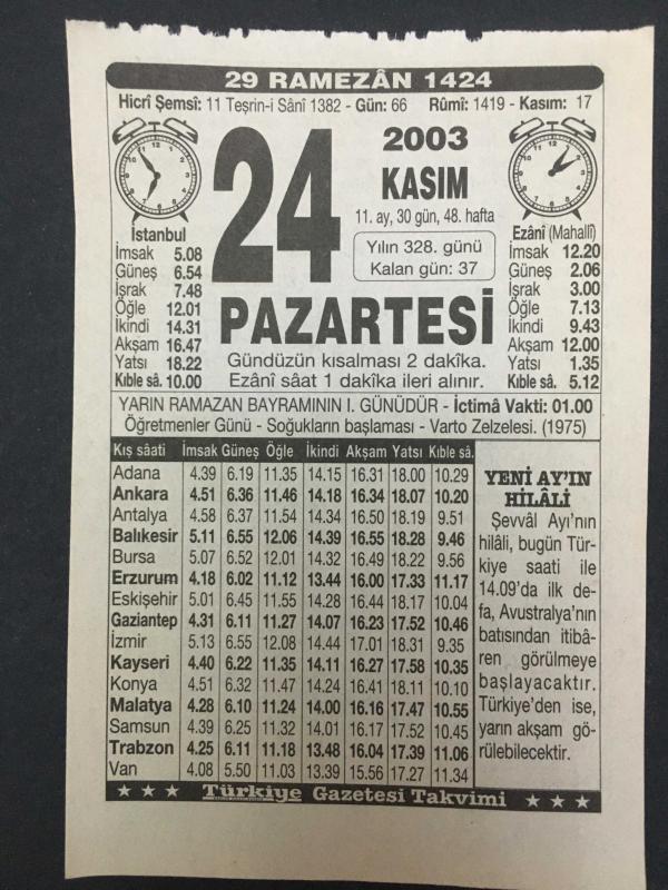 24 KASIM 2003-TAKVİM YAPRAĞI-DOĞUM GÜNÜ HEDİYESİ-TÜRKİYE GAZETESİ TAKVİMİ,ÖĞRETMENLER GÜNÜ SOĞUKLARIN BAŞLAMASI VARTO ZELZELESİ 1975,BAYRAM GÜNLERİ, en son 8 ay önce güncellenmiştir.