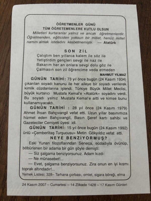 24 KASIM 2007 - TAKVİM YAPRAĞI - DOĞUM GÜNÜ HEDİYESİ - BÜYÜK SAATLİ MAARİF TAKVİMİ - MUSTAFA KEMAL ATATÜRK - ÖĞRETMENLER GÜNÜ - MAHMUT YILMAZ - SOYADI KANUNUNUN ÇIKMASI - AHMET İHSAN BAHÇIVANGİL VEFAT ETTİ - ÇEMBERLİTAŞ TURŞUCUSU METİN GÖKYILDIZ VEFAT ETTİ, en son 8 ay önce güncellenmiştir.