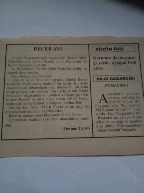 24 Kasım 1995-Orijinal Takvim Yaprağı-Doğum Günü-Söz,Nişan,Nikâh,Düğün ve Önemli Günler Hediyesi-Fatih Hak ve Hizmet Vakfı-Ayet/Hadis(Müslim/İmare 1841)-Receb Ayı-Sözün Özü-En Hayırlı başlıklı ürün, Efemera, Müzik, Sinema > Belge ve Evraklar > Takvimler kategorisi altında İkinci El olarak satılmaktadır.