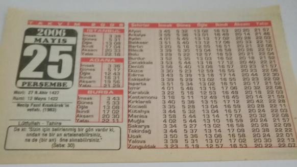 24 Mayıs 2006-Orijinal Takvim Yaprağı-Doğum Günü-Söz,Nişan,Nikâh,Düğün ve Önemli Günler Hediyesi-Bizim Anadolu Takvimleri-Ayet-Hadis(Sebe:30)(Necip Fazıl Kısakürek'in vefatı(1983))-Lütfullah,Tahire-Hastaların Namazı-İstiane Duası, en son 3 ay önce güncellenmiştir.