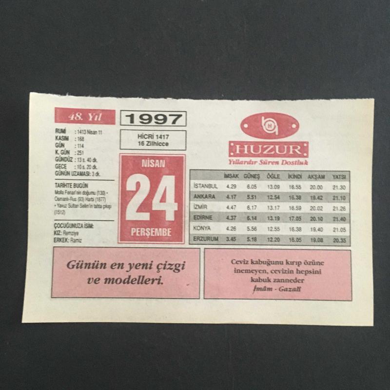 24 NİSAN 1997 -TAKVİM YAPRAĞI-DOĞUM GÜNÜ HEDİYESİ-HUZUR TAKVİMİ,MOLLA FENARİNİN DOĞUMU,OSMANLI RUS SAVAŞI,93 HARBİ,1877,YAVUZUN TAHTA ÇIKIŞI 1512,ÇOCUĞUNUZA İSİM,HASTALIKLAR KEFFERETTİR,MOLLA FENARİ başlıklı ürün, Efemera, Müzik, Sinema > Belge ve Evraklar > Takvimler kategorisi altında İkinci El olarak satılmaktadır.