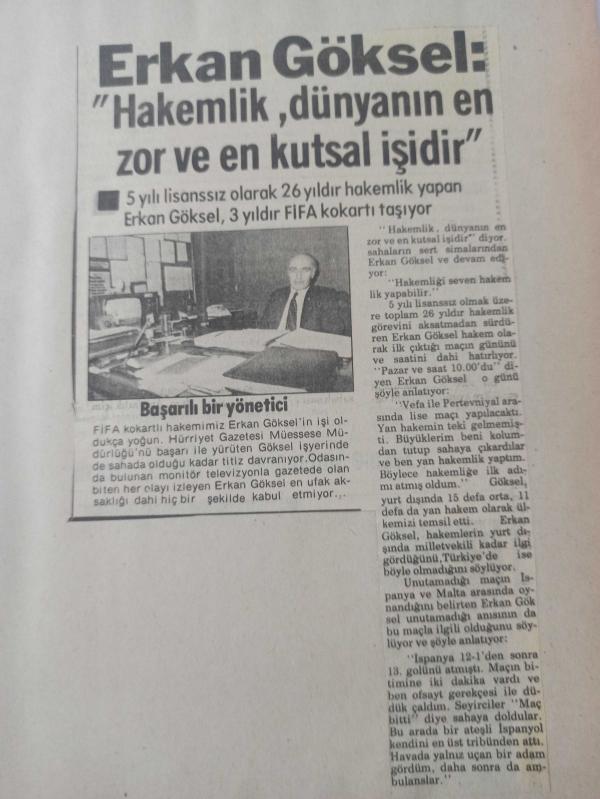 24 Nisan 1984 - Erkan Göksel: ''Hakemlik, dünyanın en zor ve en kutsal işidir'' - 5 yılı lisanssız olarak 26 yıldır hakemlik yapan Erkan Göksle, 3 yıldır FİFA kokartı taşıyor - Başarılı bir yönetici - Gazete haberi - Tek Yaprak Arkalı Önlüdür, Erol Duru tarafından kaleme alınmıştır. Kitap 1984 yılında yayınlanmıştır. 2 sayfadır. 24 Nisan 1984 - Erkan Göksel: ''Hakemlik, dünyanın en zor ve en kutsal işidir'' - 5 yılı lisanssız olarak 26 yıldır hakemlik yapan Erkan Göksle, 3 yıldır FİFA kokartı taşıyor - Başarılı bir yönetici - Gazete haberi - Tek Yaprak Arkalı Önlüdür adlı eser Türkçe dilindedir.