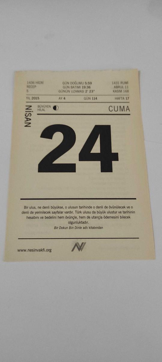 24 Nisan 2015-Orijinal Takvim Yaprağı-Doğum Günü-Söz,Nişan,Nikâh,Düğün ve Önemli Günler Hediyesi-Nesin Vakfı Takvimi-Bizim Apartmanın Sahibi-Aziz Nesin'in Damda Deli Var adlı kitabından., en son dün güncellenmiştir.