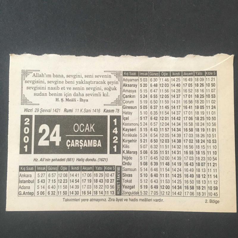 24 OCAK 2001 -TAKVİM YAPRAĞI-DOĞUM GÜNÜ HEDİYESİ-HİZMET TAKVİMİ,HZ.ALİNİN ŞEHADETİ 661,HALİÇ DONDU 1621 başlıklı ürün, Efemera, Müzik, Sinema > Belge ve Evraklar > Takvimler kategorisi altında İkinci El olarak satılmaktadır.