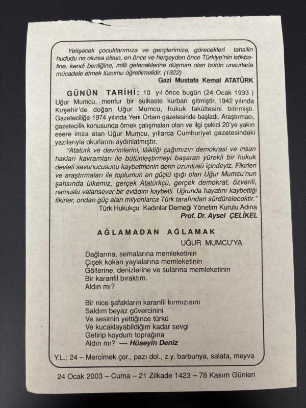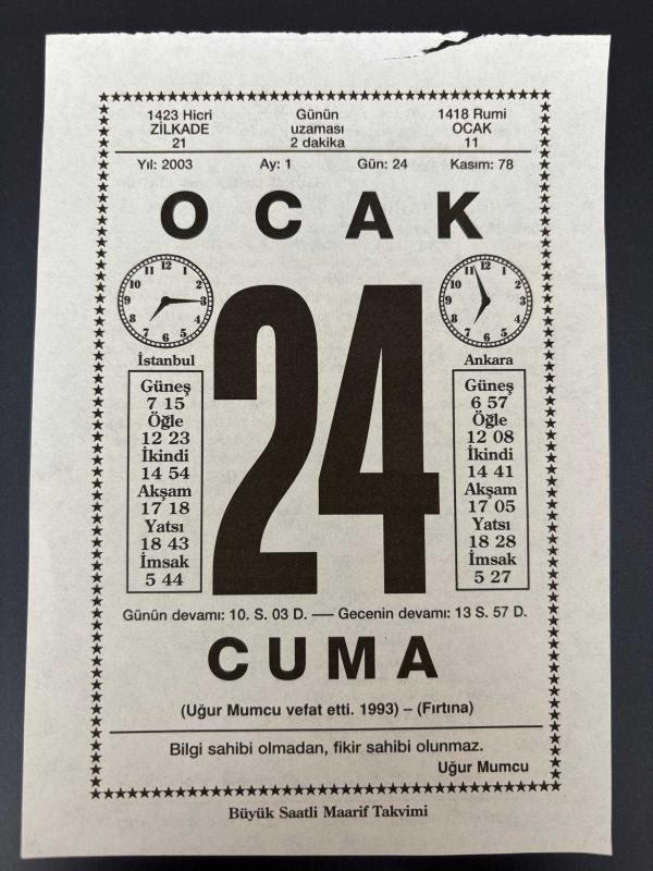 24 OCAK 2003 - TAKVİM YAPRAĞI - DOĞUM GÜNÜ HEDİYESİ - BÜYÜK SAATLİ MAARİF TAKVİMİ - UĞUR MUMCU - GAZİ MUSTAFA KEMAL ATATÜRK - UĞUR MUMCU SUİKAST SONUCU ÖLDÜ - PROF. DR. AYSEL ÇELİKEL - HÜSEYİN DENİZ, 7 ay önce satışa sunulmuştur.