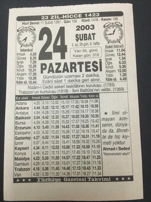 24 ŞUBAT 2003-TAKVİM YAPRAĞI-DOĞUM GÜNÜ HEDİYESİ-TÜRKİYE GAZETESİ TAKVİMİ,NİZAMI CEDİDİN KURULUŞU 1793,TRABZONUN KURTULUŞU,1918,İBNİ BATTUTANIN VEFATI 1369,EZANSIZ SEMTLER 9, 1 yıl önce satışa sunulmuştur.