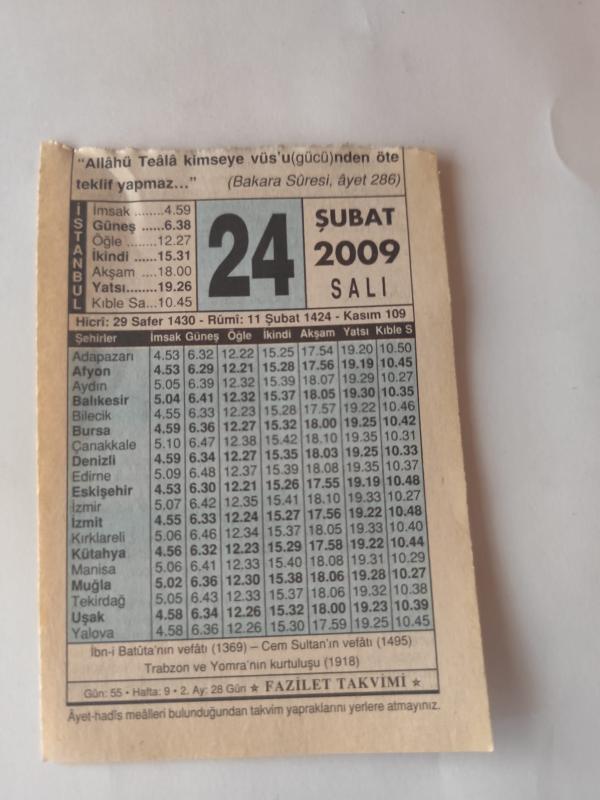 24 Şubat 2009-Orijinal Takvim Yaprağı-Doğum Günü-Söz,Nişan,Nikâh,Düğün ve Önemli Günler Hediyesi-Fazilet Takvimi-Ayet(Hadis)(Bakara Suresi, Ayet 286 )-İbn-i Batuta'nın vefatı (1369)-İmam-ı Azam (H.H.)-Bilmiyorum Diyebilmek- Saferu'l-Hayr, en son bir ay önce güncellenmiştir.
