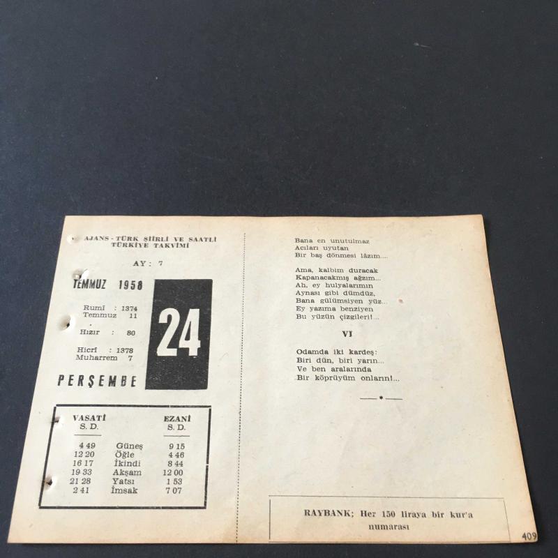 24 TEMMUZ 1958 -TAKVİM YAPRAĞI-DOĞUM GÜNÜ HEDİYESİ-AJANS-TÜRK ŞİİRLİ VE SAATLİ TÜRKİYE TAKVİMİ,CEMAL YEŞİL,FAL,FIKRA,LOZAN BARIŞ ANLAŞMASININ İMZASI 1923,GÜZEL SÖZ,YEMEK LİSTESİ, en son 8 ay önce güncellenmiştir.