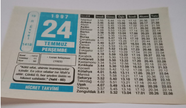 24 Temmuz 1997-Orijinal Takvim Yaprağı-Doğum Günü-Söz,Nişan,Nikâh,Düğün ve Önemli Günler Hediyesi-Hicret Takvimi-Ayet(Hadis)-(Hadis)-(Nahl 60)-Lozan Antlaşması(1923)-Hz.Lut(A.S.)-Muhammed İkbal (Rah.A.) başlıklı ürün, Efemera, Müzik, Sinema > Belge ve Evraklar > Takvimler kategorisi altında İkinci El olarak satılmaktadır.