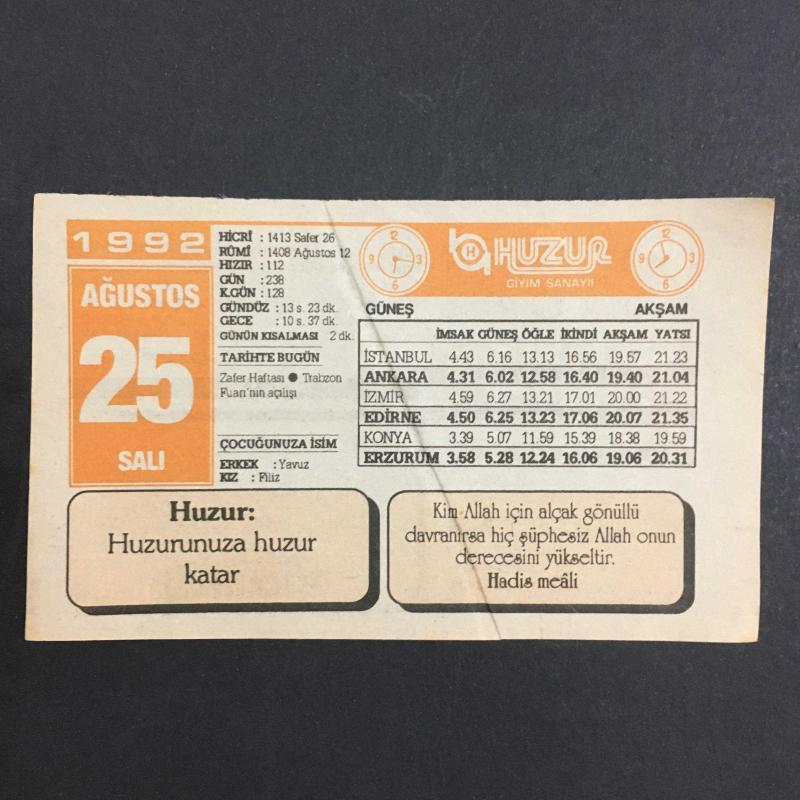 25 AĞUSTOS 1992 -TAKVİM YAPRAĞI-DOĞUM GÜNÜ HEDİYESİ-HUZUR TAKVİMİ,ZAFER HAFTASI,TRABZON FUARININ AÇILIŞI,ÇOCUĞUNUZA İSİM,HİÇ OLMAZSA,DUDAKLAR NEDEN ÇATLAR başlıklı ürün, Efemera, Müzik, Sinema > Belge ve Evraklar > Takvimler kategorisi altında İkinci El olarak satılmaktadır.