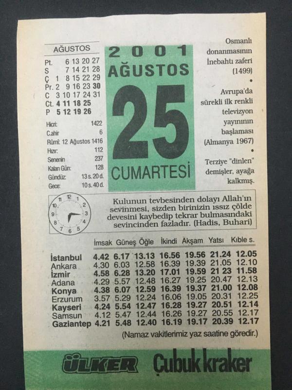 25 AĞUSTOS 2001-TAKVİM YAPRAĞI-DOĞUM GÜNÜ HEDİYESİ-ÜLKER TAKVİMİ,OSMANLI DONANMASININ İNEHTI ZAFERİ 1499,AVRUPADA SÜREKLİ İLK RENKLİ TMANYA 1967,HACI BAYRAM VELİ 1429,ELEVİZYON YAYININ BAŞLAMASI AL, en son 8 ay önce güncellenmiştir.