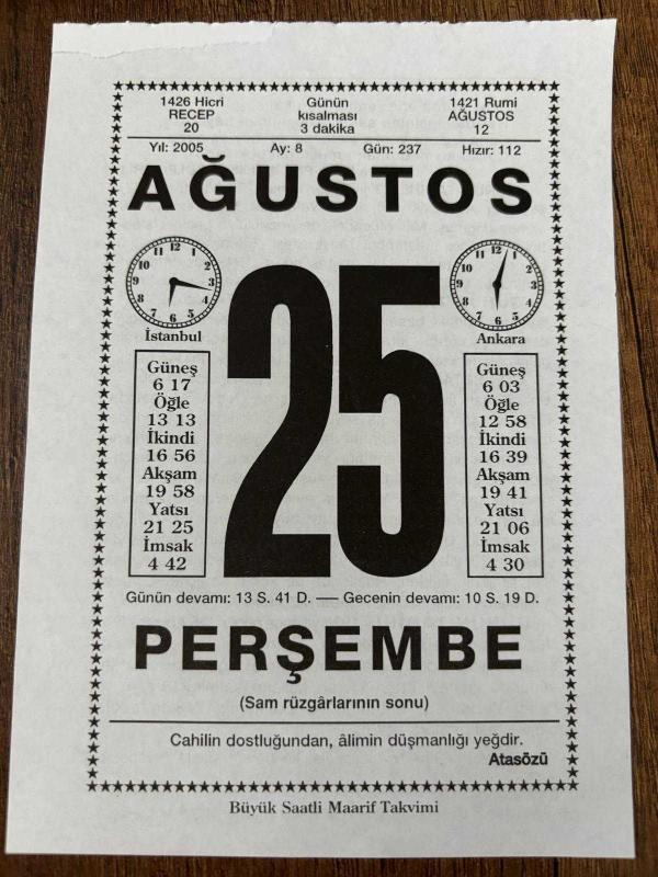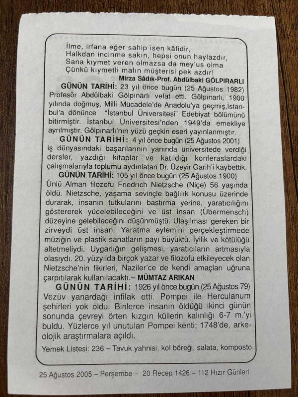 25 AĞUSTOS 2005 - TAKVİM YAPRAĞI - DOĞUM GÜNÜ HEDİYESİ - BÜYÜK SAATLİ MAARİF TAKVİMİ - ATASÖZÜ - PROF.ABDULBAKİ GÖLPINARLI - PROF.ABDULBAKİ GÖLPINARLI'NIN VEFATI - DR.ÜZEYİR GARİH VEFAT ETTİ - VEZÜV YANARDAĞI İNFİLAK ETTİ - MÜMTAZ ARIKAN, en son 8 ay önce güncellenmiştir.