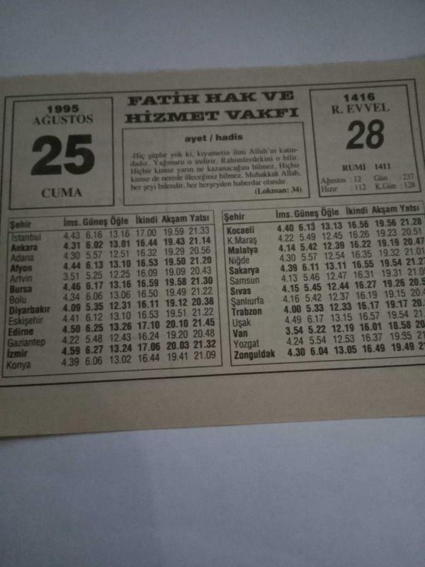 25 Ağustos 1995-Orijinal Takvim Yaprağı-Doğum Günü-Söz,Nişan,Nikâh,Düğün ve Önemli Günler Hediyesi-Fatih Hak ve Hizmet Vakfı-Ayet/Hadis(Lokman:34)-Yapay Kulak Geliştirildi-Sözün Özü-50 Yıl Önce Helikopterler, en son 4 ay önce güncellenmiştir.