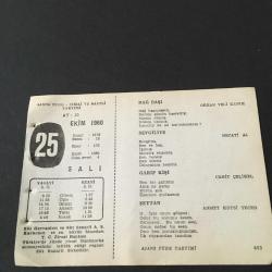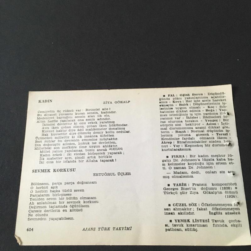 25 EKİM 1960 -TAKVİM YAPRAĞI-DOĞUM GÜNÜ HEDİYESİ-AJANS TÜRK-ŞİİRLİ VE SAATLİ TAKVİMİ,ORHAN VELİ KANIK,NECATİ AL,CAHİT ÇELİKEL,AHMET KUTSİ TECER,ZİYA GÖKALP,ERTUĞRUL ÜÇLER,FAL,FIKRA,GEORGES BİZETİN DOĞUMU,1838,ZİYA GÖKALPİN ÖLÜMÜ 1924,GÜZEL SÖZ,YEMEK LİSTESİ başlıklı ürün, Efemera, Müzik, Sinema > Belge ve Evraklar > Takvimler kategorisi altında İkinci El olarak satılmaktadır.