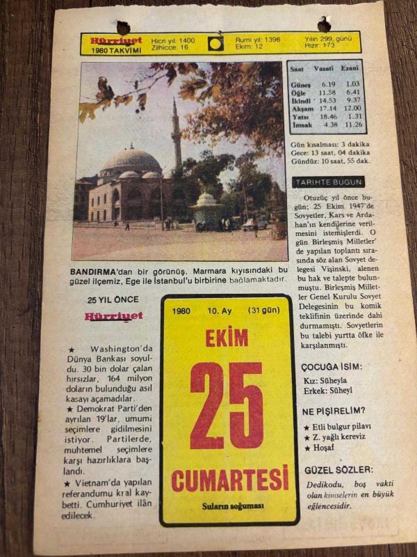 25 EKİM 1980 - TAKVİM YAPRAĞI - DOĞUM GÜNÜ HEDİYESİ - HÜRRİYET TAKVİMİ - ESKİ BİR ŞARKI ADLI ROMAN - Şair Behçet Kemal Çağlar'ın ölümü (1969) - Ziya Gökalp'in ölümü (1924), en son 7 ay önce güncellenmiştir.