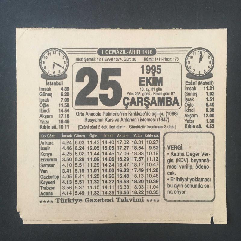 25 EKİM 1995 -TAKVİM YAPRAĞI-DOĞUM GÜNÜ HEDİYESİ-TÜRKİYE GAZETESİ TAKVİMİ,ORTA ANADOLU RAFİNERİSİNİN KIRIKKALEDE AÇILIŞI 1986,RUSYANIN KARS VE ARDAHANI İSTEMESİ 1947,TESTİ KEBABI,AĞAÇLAR başlıklı ürün, Efemera, Müzik, Sinema > Belge ve Evraklar > Takvimler kategorisi altında İkinci El olarak satılmaktadır.