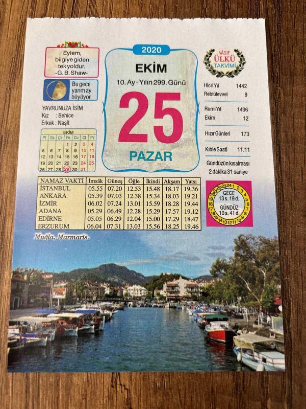 25 EKİM 2020 - TAKVİM YAPRAĞI - DOĞUM GÜNÜ HEDİYESİ - BÜYÜK SAATLİ MAARİF TAKVİMİ - Muğla, Marmaris - HANGİMİZ YIRTICIYIZ? - ANLAŞMAZLIK - 1961 - TBMM yeniden açıldı ve 27 Mayıs 1960'da gerçekleşen Türkiye Cumhuriyeti tarihinin ilk askeri darbesi sona erdi - 1984- Türkiye'deki son idam cezası infaz edildi - 2017 - Albert Einstein'ın 1922'de Japonya'da bir kuryeye bahşiş yerine verdiği ve mutluluğu tarif ettiği not, Kudüs'te yapılan açık artırmada 1,56 milyon dolara satıldı, 3 ay önce satışa sunulmuştur.