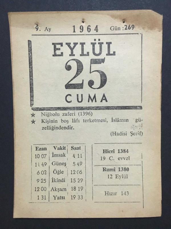 25 EYLÜL 1964-TAKVİM YAPRAĞI-DOĞUM GÜNÜ HEDİYESİ,NİĞBOLU ZAFERİ,1396,HUTBE, 1 yıl önce satışa sunulmuştur.