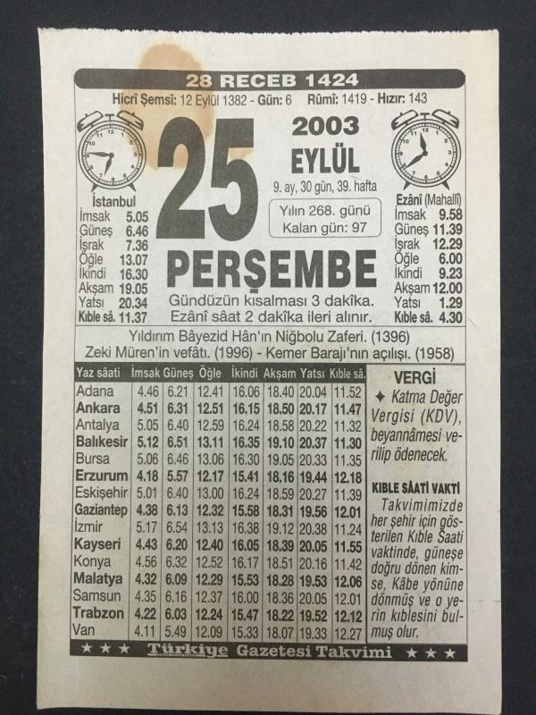 25 EYLÜL 2003-TAKVİM YAPRAĞI-DOĞUM GÜNÜ HEDİYESİ-TÜRKİYE GAZETESİ TAKVİMİ,YILDIRIM BAYEZITIN NİĞBOLU ZAFERİ,1396,ZEKİ MÜRENİN VEFATI 1996,KEMER BARAJININ AÇILIŞI,1958,MAL İLE İMTİHAN OLMAK, en son 8 ay önce güncellenmiştir.