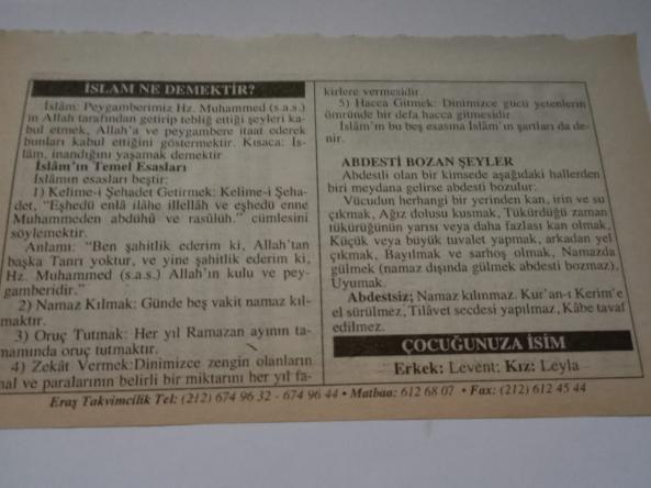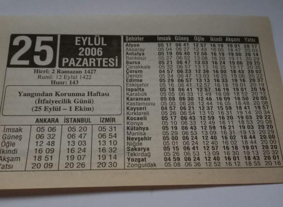 25 Eylül 2006-Orijinal Takvim Yaprağı-Doğum Günü-Söz,Nişan,Nikâh,Düğün ve Önemli Günler Hediyesi-ERAŞ Hizmet Takvimi-Ayet-Hadis(Yangından Korunma Haftası (İtfaiyecilik Günü)-İslam Ne Demektir?-Abdesti Bozan Şeyler-Çocuğunuza İsim:Levent,Leyla, en son 4 ay önce güncellenmiştir.