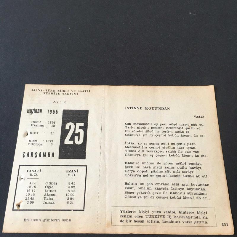 25 HAZİRAN 1958 -TAKVİM YAPRAĞI-DOĞUM GÜNÜ HEDİYESİ-AJANS-TÜRK ŞİİRLİ VE SAATLİ TÜRKİYE TAKVİMİ,VASIF,CHRİSTİNA ROSETTİ,FAL,FIKRA,KORE HARBİNİN BAŞLAMASI 1951,GÜZEL SÖZ,YEMEK LİSTESİ başlıklı ürün, Efemera, Müzik, Sinema > Belge ve Evraklar > Takvimler kategorisi altında İkinci El olarak satılmaktadır.