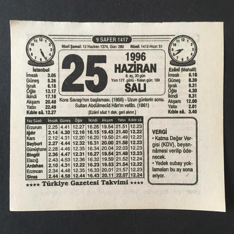 25 HAZİRAN 1996 -TAKVİM YAPRAĞI-DOĞUM GÜNÜ HEDİYESİ-TÜRKİYE GAZETESİ TAKVİMİ,KORE SAVAŞININ BAŞLAMASI,1950,UZUN GÜNLERİN SONU,ABDULMECİD HANIN VEFATI 1861,BAZI TAVSİYELER,ZAYIFLAMAK İÇİN, en son 8 ay önce güncellenmiştir.