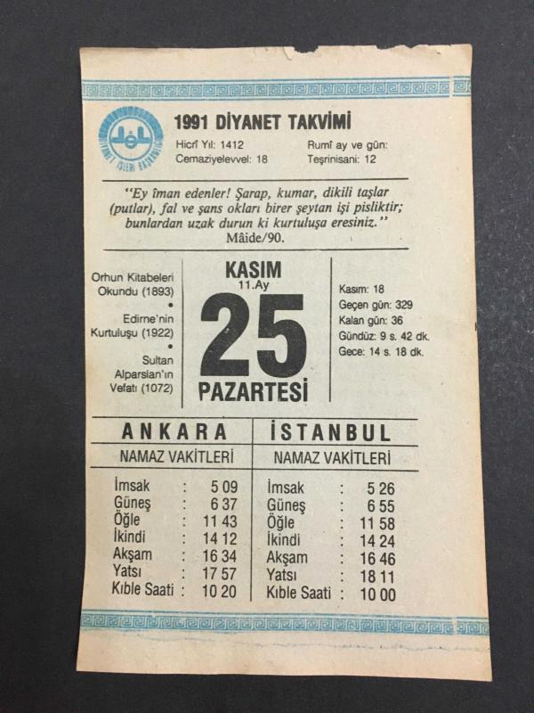 25 KASIM 1991 -TAKVİM YAPRAĞI-DOĞUM GÜNÜ HEDİYESİ-DİYANET TAKVİMİ,ORHUN KİTABELERİ OKUNDU 1893,EDİNENİN KURTULUŞU 1922,ALPARSLANIN VEFATI 1072,YERLİ MALI KULLANALIM, en son 8 ay önce güncellenmiştir.