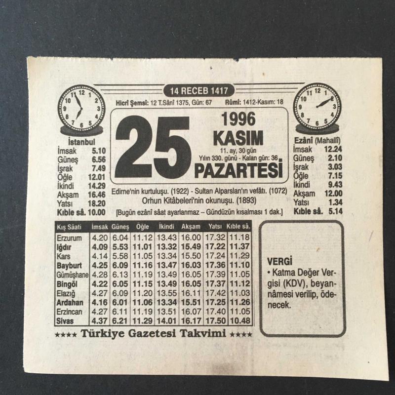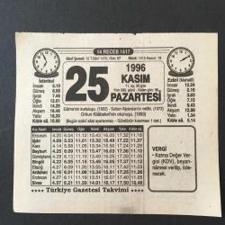 25 KASIM 1996 -TAKVİM YAPRAĞI-DOĞUM GÜNÜ HEDİYESİ-TÜRKİYE GAZETESİ TAKVİMİ,EDİRNENİN KURTULUŞU 1922,ALPARSLANIN VEFATI 1072,ORHUN KİTABELRİNİN OKUNUŞU 1893,KIZIM NASIL BULUNDU, en son 8 ay önce güncellenmiştir.