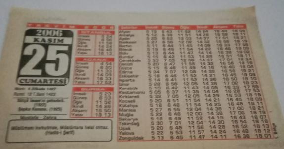 25 Kasım 2006-Orijinal Takvim Yaprağı-Doğum Günü-Söz,Nişan,Nikâh,Düğün ve Önemli Günler Hediyesi-Bizim Anadolu Takvimleri-Ayet(Hadis-i Şerif)-Sütçü İmam'ın şahadeti(1922)-Mustafa,Zehra-Son Dakika Namazı-II, en son 2 ay önce güncellenmiştir.