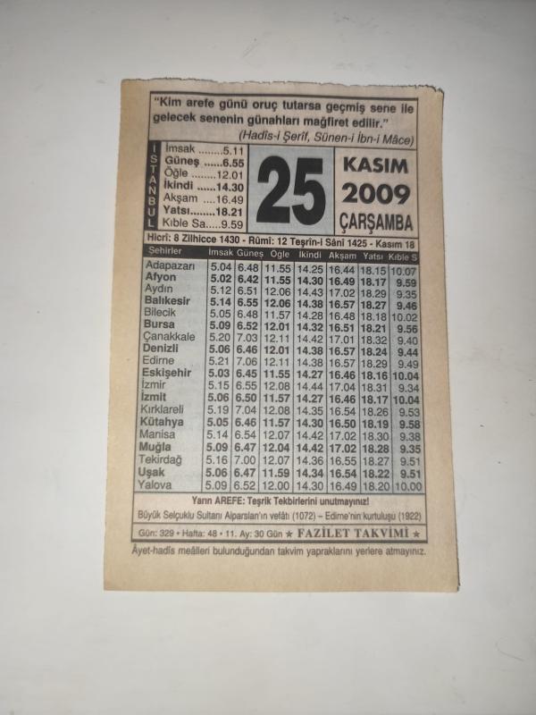 25 Kasım 2009-Orijinal Takvim Yaprağı-Doğum Günü-Söz,Nişan,Nikâh,Düğün ve Önemli Günler Hediyesi-Fazilet Takvimi-Ayet(Hadis)(Hadis-i Şerif, Sünen-i İbn-i Mace)-Yarın AREFE: Teşrik Tekbirlerini Unutmayınız! Büyük Selçuktu Sultanı Alparslan'ın Vefatı (1072)-Teşrik Tekbiri-Kurban Kesemeyenler Ne yapmalıdır? başlıklı ürün, Efemera, Müzik, Sinema > Belge ve Evraklar > Takvimler kategorisi altında İkinci El olarak satılmaktadır.