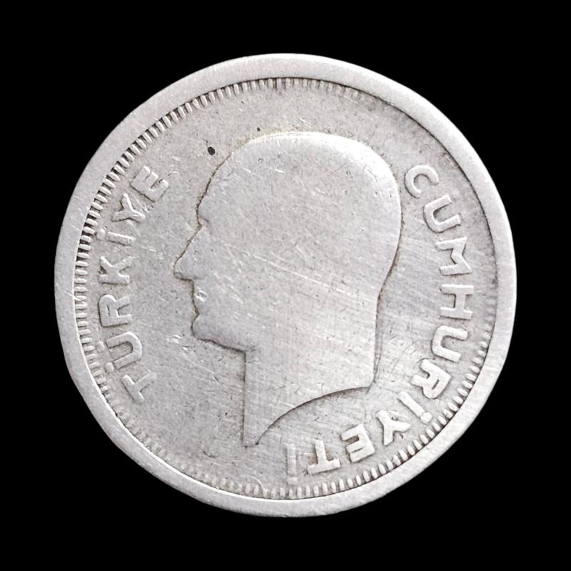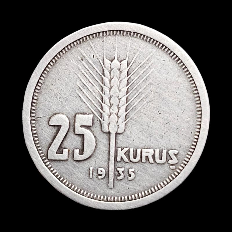 Para : 25 kuruş Hicri : 1935 Dönem : 1935-1937 Miladi : 1935 KM# : 864 Kondisyon : ÇT Condition : VF-30 Basım Adedi : 888,000 Darphane : Istanbul Maden : Gümüş Çap : 19 Ağırlık (gr.) : 3 Gümüş (gr) : 2.49