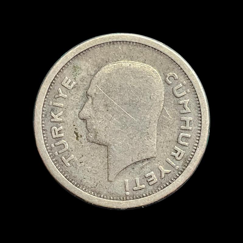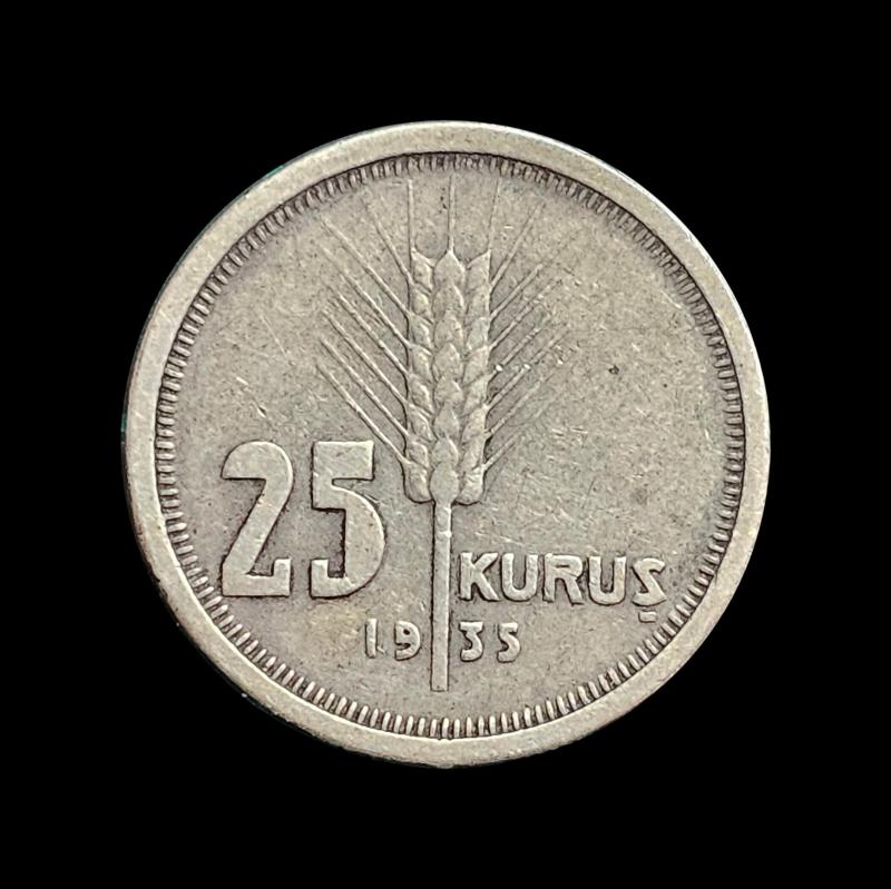 Para : 25 kuruş Hicri : 1935 Dönem : 1935-1937 Miladi : 1935 KM# : 864 Kondisyon : ÇT Condition : VF-30 Basım Adedi : 888,000 Darphane : Istanbul Maden : Gümüş Çap : 19 Ağırlık (gr.) : 3 Gümüş (gr) : 2.49