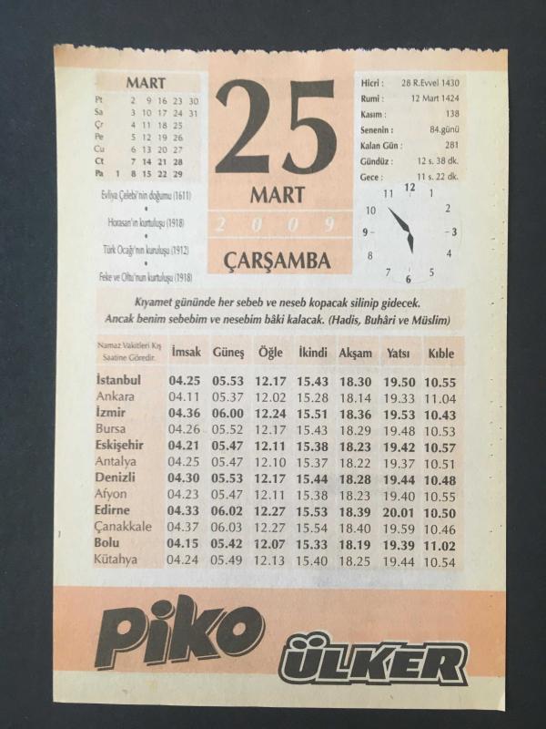25 MART 2009 -TAKVİM YAPRAĞI-DOĞUM GÜNÜ HEDİYESİ-ÜLKER TAKVİMİ,EVLİYA ÇELEBİNİN DOĞUMU 1611,HORASANIN KURTULUŞU 1918,TÜRK OCAĞININ KURULUŞU 1912,FEKE VE OLTUNUN KURTULUŞU 1918,ULAŞIM,ÇOCUĞUNUZUN İSMİ,ZEYTİNYAĞLI İMAM BAYILDI, en son 8 ay önce güncellenmiştir.
