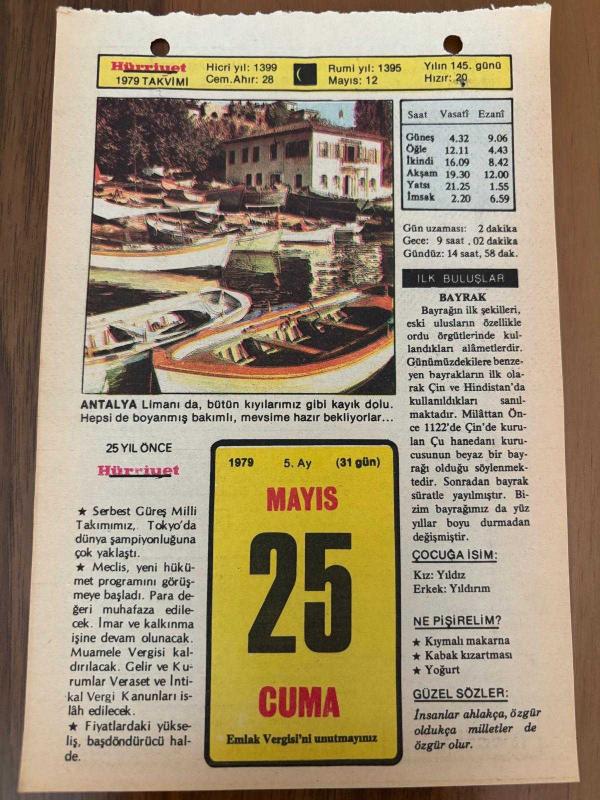 25 MAYIS 1979 - TAKVİM YAPRAĞI - DOĞUM GÜNÜ HEDİYESİ - HÜRRİYET TAKVİMİ - ÖLÜM TANRISI ROMANI - Kırklareli Pınarhisar Panayırı - Balıkesir'de Karapürçek panayırı - Havza'da "Atatürk'ün gelişini anma günü" - Romancı Nizamettin Nazif'in ölümü (1970) - Tarihçi Cevdet Paşa'nın ölümü (1895), en son 8 ay önce güncellenmiştir.