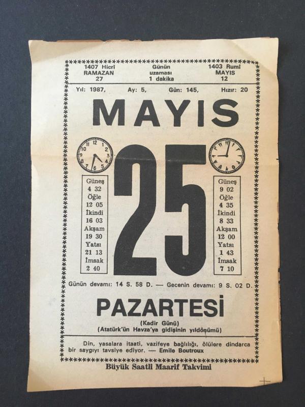 25 MAYIS 1987 -TAKVİM YAPRAĞI-DOĞUM GÜNÜ HEDİYESİ-BÜYÜK SAATLİ MAARİF TAKVİMİ,ATATÜRKÜN HAVZAYA GİDİŞİNİN YILDÖNÜMÜ,SAĞIRLIĞIN ZEVKLERİ,NİNNİ,ERKEKLERDE NAZİK ÇAĞ, 1 yıl önce satışa sunulmuştur.