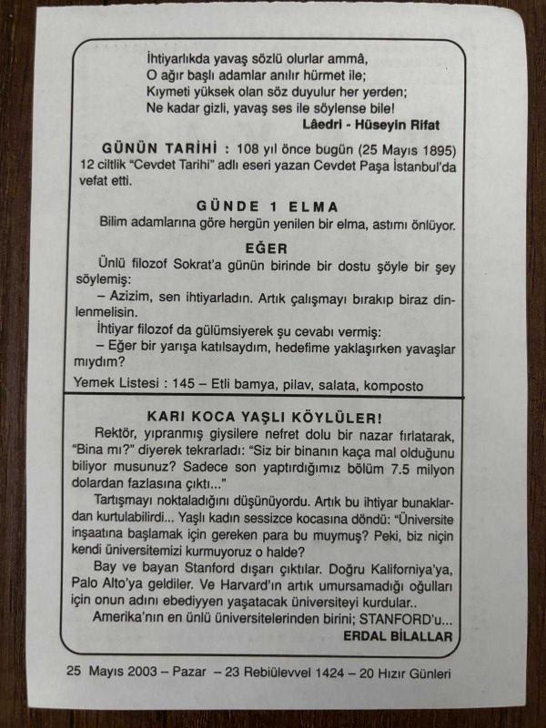 25 MAYIS 2003 - TAKVİM YAPRAĞI - DOĞUM GÜNÜ HEDİYESİ - BÜYÜK SAATLİ MAARİF TAKVİMİ - DR.FARUK BAYÜLKEM - HÜSEYİN RİFAT - CEVDET PAŞA VEFAT ETTİ - GÜNDE 1 ELMA - EĞER - KARI KOCA YAŞLI KÖYLÜLER - ERDAL BİLLALLAR, en son 8 ay önce güncellenmiştir.